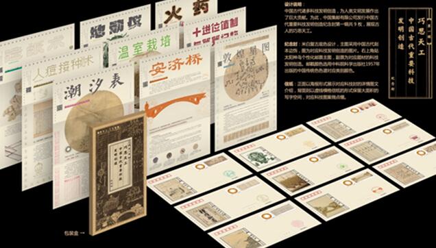 《古代科技封》基于中國科學(xué)院自然科學(xué)史研究所階段性研究成果“中國古代重要科技發(fā)明創(chuàng)造”88項(xiàng),其中分為科學(xué)發(fā)現(xiàn)與創(chuàng)造(30項(xiàng))、技術(shù)發(fā)明(45項(xiàng))、工程成就(13項(xiàng))三大類,農(nóng)學(xué)與紡織、數(shù)學(xué)、天文、醫(yī)藥學(xué)、材料與制器、機(jī)器與儀器、車船火藥與火器、土木工程、光學(xué)地學(xué)與韻律學(xué)九大類別。