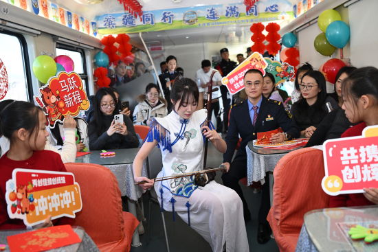 文藝表演環(huán)節(jié)精彩迭出,為旅途注入鮮活氣息。一曲《美麗家園》唱出游子對(duì)故鄉(xiāng)的深情眷戀,喚起旅客心中共同的團(tuán)圓情結(jié);舞蹈《草原花正開》以舒展的舞姿、明快的節(jié)奏,勾勒出草原的遼闊生機(jī),仿佛提前帶來春的氣息;二胡獨(dú)奏《賽馬》激昂奔放,弦音如蹄,奏響新春的蓬勃朝氣,引來陣陣掌聲;《烏蘭巴托的夜》深情悠遠(yuǎn),撫慰旅途思念,增添一抹詩(shī)意的溫暖;最后的器樂彈唱《奔跑》以熟悉旋律點(diǎn)燃全場(chǎng),傳遞出向前奮進(jìn)的青春力量。