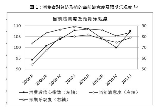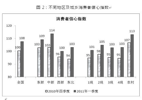 2011年一季度中國(guó)消費(fèi)者信心指數(shù)為108,比2010年四季度大幅上升8點(diǎn),接近近兩年高點(diǎn)。消費(fèi)者對(duì)當(dāng)前經(jīng)濟(jì)形勢(shì)的滿意度和對(duì)未來(lái)經(jīng)濟(jì)走勢(shì)的預(yù)期樂觀度均明顯上升,持樂觀態(tài)度的消費(fèi)者比重均接近兩年內(nèi)的最高點(diǎn)。