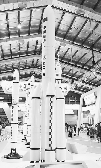 長征五號(hào)運(yùn)載火箭模型。長征五號(hào)系列運(yùn)載火箭是我國新一代大型運(yùn)載火箭。以CZ—5E為例,其為兩級(jí)狀態(tài)火箭,芯級(jí)直徑5米,捆綁 4個(gè)3.35米直徑的助推器,起飛質(zhì)量856噸,計(jì)劃2014年實(shí)現(xiàn)首飛。CZ—5E火箭已初步被確定為用于月球表面采樣和返回任務(wù)用火箭。