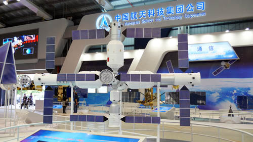在此次航展中,中國航天科技集團公司推出代表月球探測工程最新成果的“嫦娥二號”衛(wèi)星模型,代表“北斗導(dǎo)航”工程、直徑達7米、蔚為壯觀的天地一體衛(wèi)星運行沙盤,1:1的“天宮一號”目標(biāo)飛行器模型、新一代運載火箭以及代表深空探測計劃的“螢火一號”衛(wèi)星模型等國家重大工程項目近100項新展品首次亮相。圖為長期有人照料的空間站模型。(宗文)